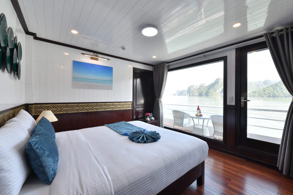 - 14:00: When lunch is about to finish, it is just nice that the Cruise completes its entry through the Cua Van area to Lan Ha Bay (as part of Halong Bay). The area is surrounded by a lot of extraordinary limestone karst landscapes. Guests can start their journey to explore Lan Ha Bay by Kayaking and swimming in the crystal clear waters of the bay